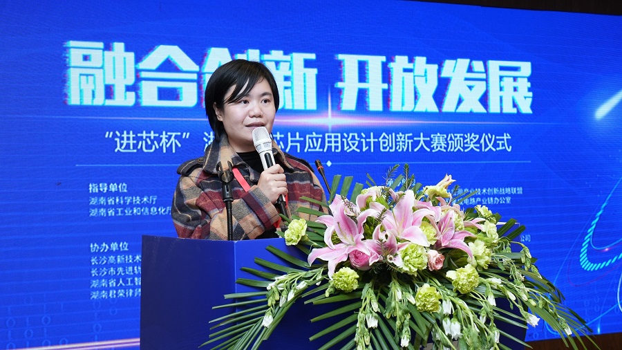 評審結束后,長沙工業和信息化局副局長張芬發表重要講話。她表示集成電路產業的高質量發展離不開產業鏈上各企業的協同創新,本次芯片應用設計創新大賽秉承著“用心打造產業生態,推動行業協同發展”的精神,重點挖掘芯片創新應用領域的優質項目和專業人才,這是一次多方共贏、成效倍加的有益嘗試。最后她誠摯感謝行業人士和各大高校對本次比賽的大力支持,同時也真誠地希望越來越多的企業家和專業技術人才選擇留在長沙,為長沙集成電路產業發展添磚加瓦。