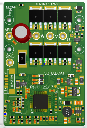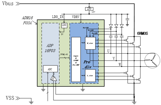 進芯電子電動工具電機控制方案是基于16位定點DSP芯片ADM16F03A開發設計的,芯片主頻為100MHz,搭載延時濾波和運算加速單元,內置4K x 16 位 SARAM、(256+256+32)x16位DARAM、32Kx16位Flash,支持8路PWM輸出,SCI等豐富外設接口,內部集成了6 NMOS Pre-Driver、運算放大器、PGA、比較器、高速ADC等模塊,具有高整合度、高抗干擾、高可靠性的特點,非常適用于BLDC/PMSM電機方波、FOC 驅動控制。