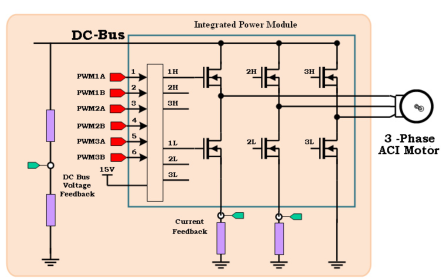 ADP32Fx 的 PWM 模塊運用 SVPWM 技術產生 6 個脈寬調制(PWM)信號,用于驅動 6 個功率開關器件。ADC 模塊采樣電機兩個相線的電流信號 Ia 和 Ib。通過電阻分壓的方式將直流母線的電壓送到芯片的 AD 引腳。