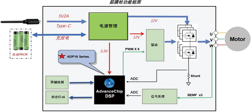 筋膜槍解決方案基于進芯ADP16F03系列高性價比16位DSP芯片,實現手持筋膜槍的多種智能控制。