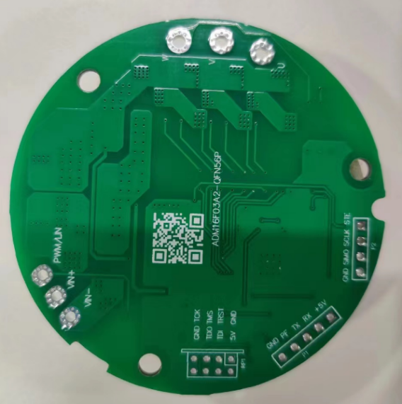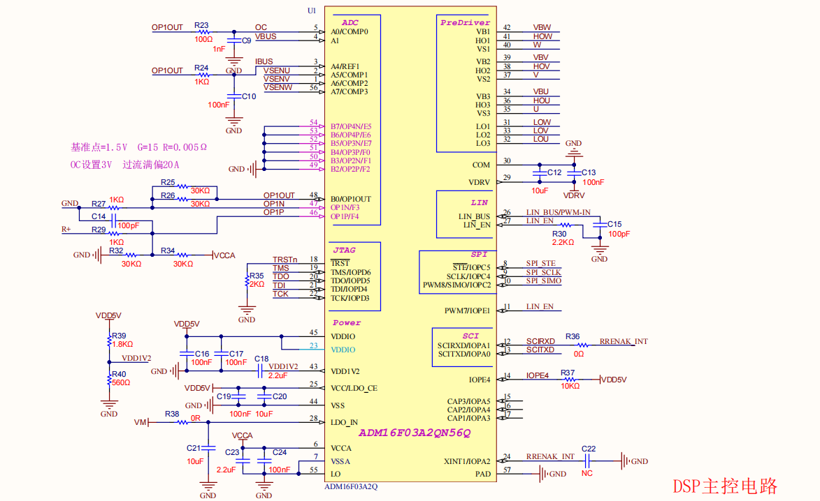 電路模塊主要包括: 輸入防反母線電容輸入部分、ADM16F03A2最小系統(tǒng)、功率橋電路、ADC母線采樣電路、單電阻采樣運(yùn)放采樣電路、自舉電路和PWM/LIN通訊反饋電路。