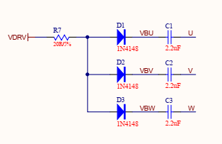 功率橋電路采用上下管均為NMOS的配置,總計(jì)6個(gè)NMOS組成三相H半橋驅(qū)動(dòng)電路。