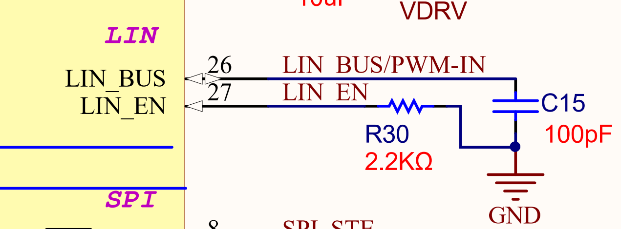 芯片內(nèi)部集成LIN芯片,內(nèi)部兼容識(shí)別PWM,可以通過(guò)輸入PWM/LIN進(jìn)行通訊調(diào)速和反饋故障。使能LIN_EN引腳,來(lái)實(shí)現(xiàn)打開關(guān)閉LIN通訊。