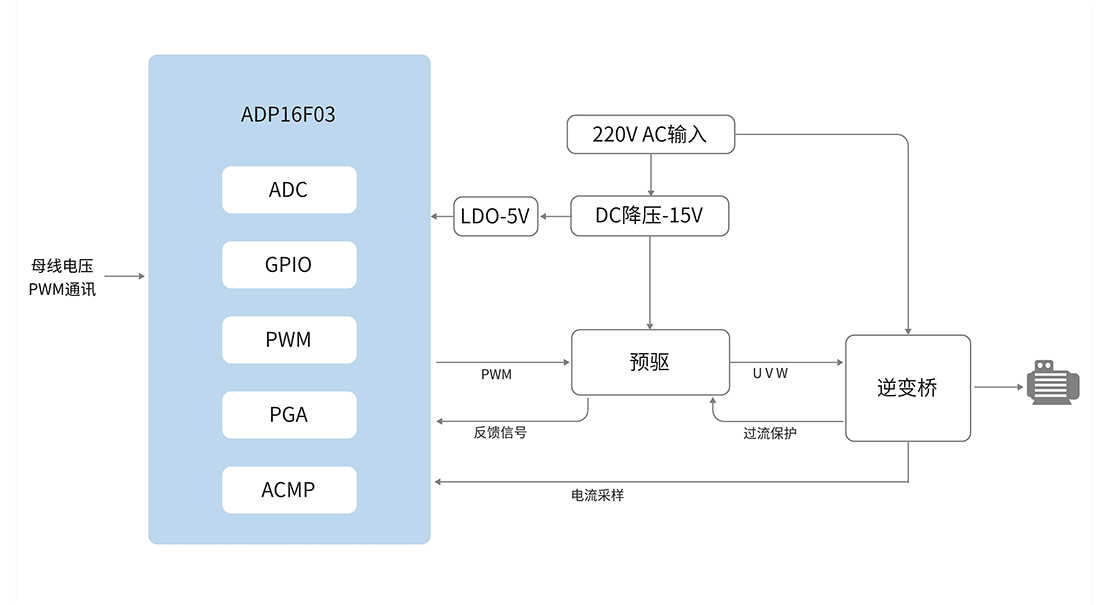 該方案具有強帶載啟動能力,弱磁升速功能,進出弱磁平滑;使用自主研發算法,讓控制更加平穩、運行噪音更小。